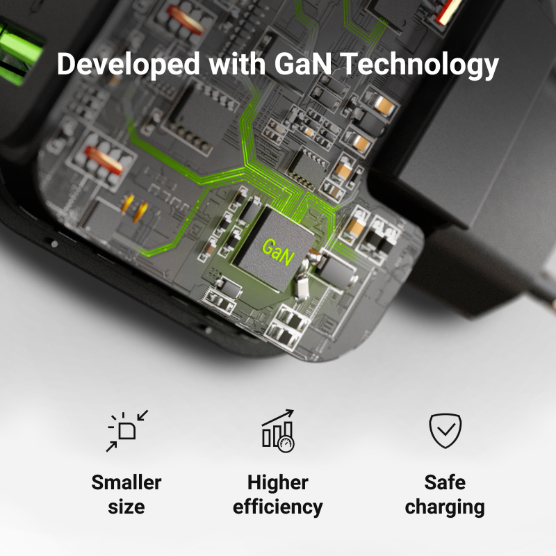 Hasta ahora se utilizaba el silicio para fabricar los semiconductores que hay en el interior del cargador. Al sustituirlo por nitruro de galio, los componentes pueden disponerse más juntos, reduciendo el tamaño del dispositivo. Lo más importante es que se ha mantenido el rendimiento del cargador GC PowerGaN de 65 W. El uso de la tecnología GaN también garantiza una baja pérdida de potencia y protección contra el sobrecalentamiento del dispositivo de carga.